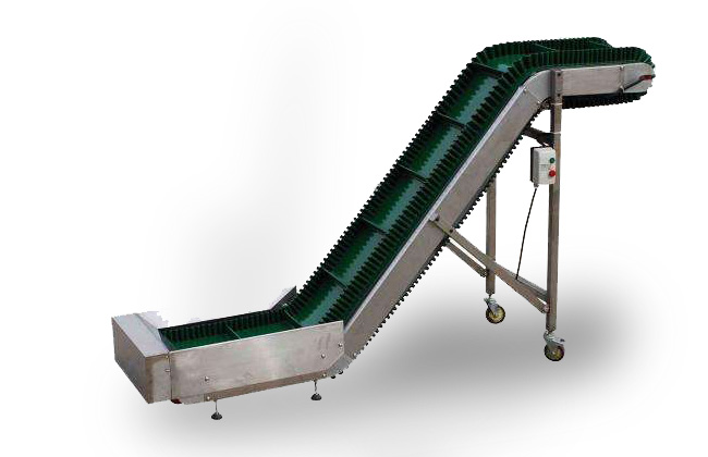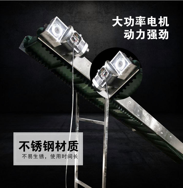 裙邊皮帶輸送機是在平形橡膠運輸帶兩側粘上可自由伸縮的橡膠波形立式"裙邊",在裙邊之間又粘有一定強度和彈性的橫隔板組成匣形斗,對物料進行連續輸送的設備。可大傾角輸送甚至垂直提升散料。
